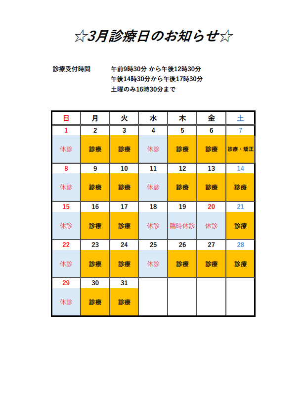 3月診療日のお知らせ(臨時休診あります)