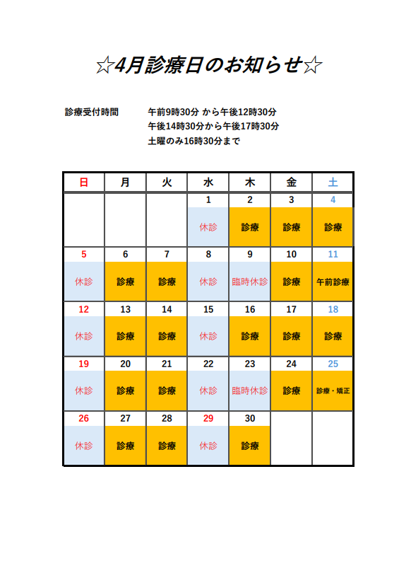4月診療日のお知らせ(臨時休診あります)